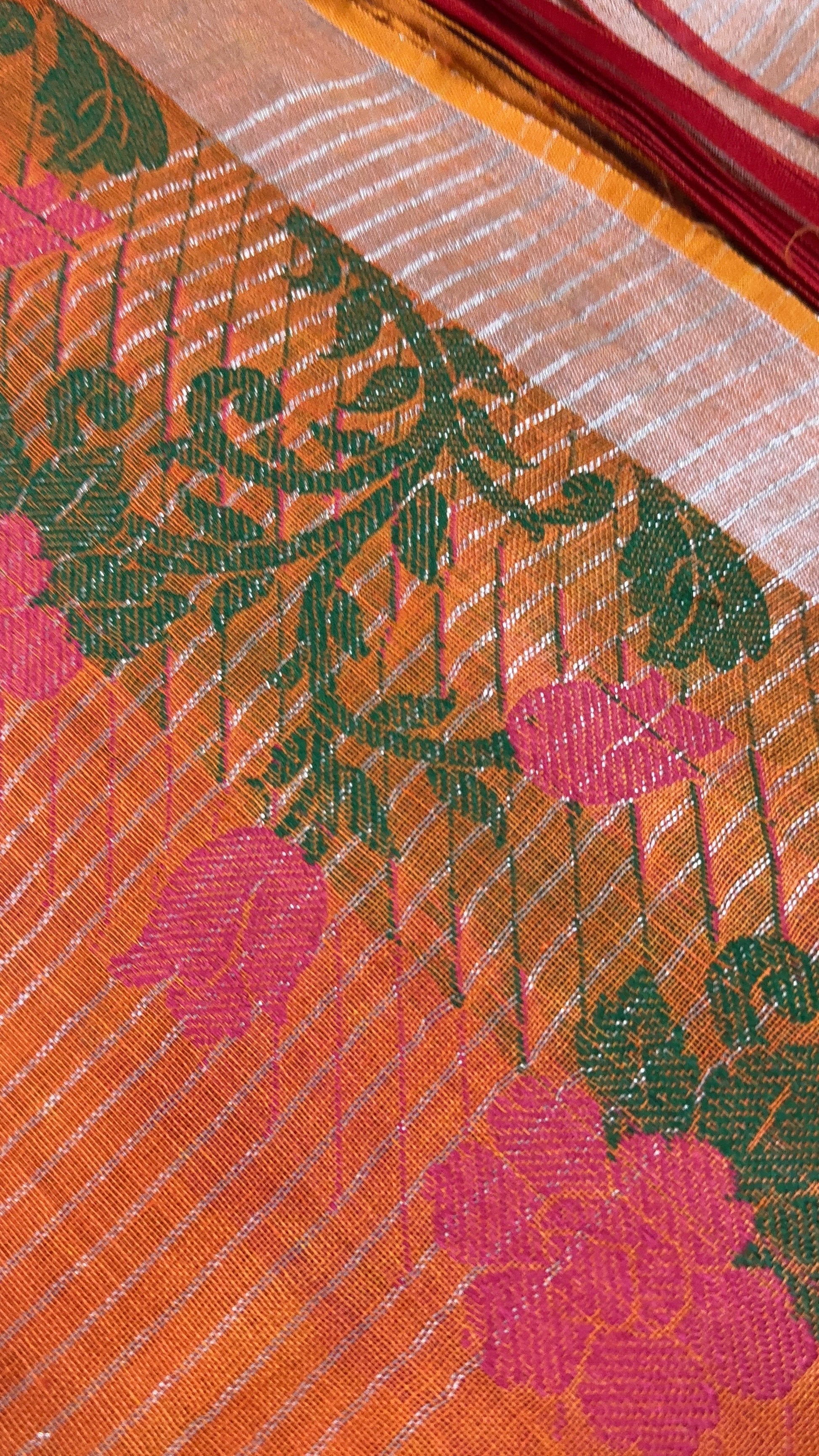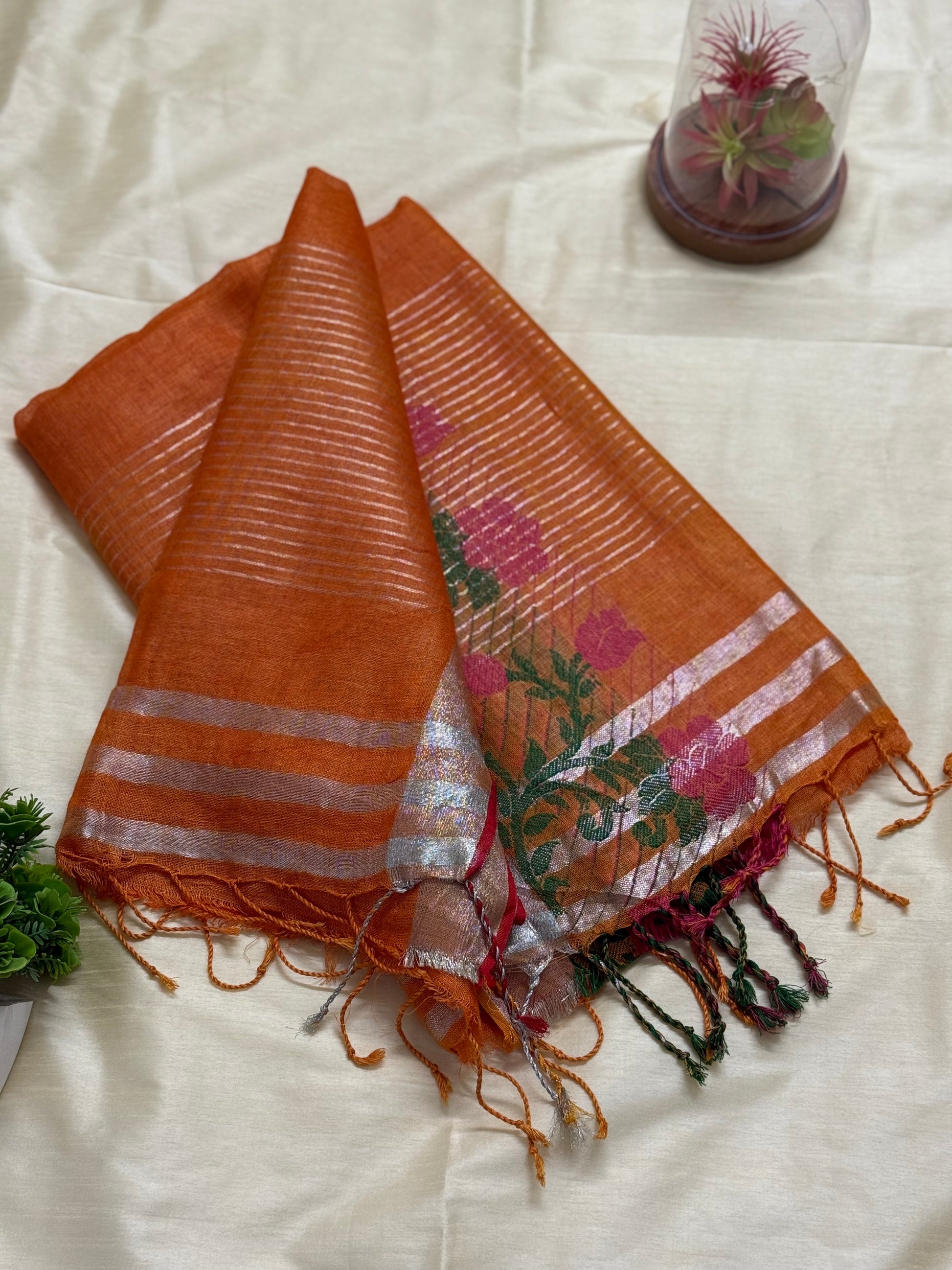 Embroidered Orange Linen-Cotton Saree with Silver Zari