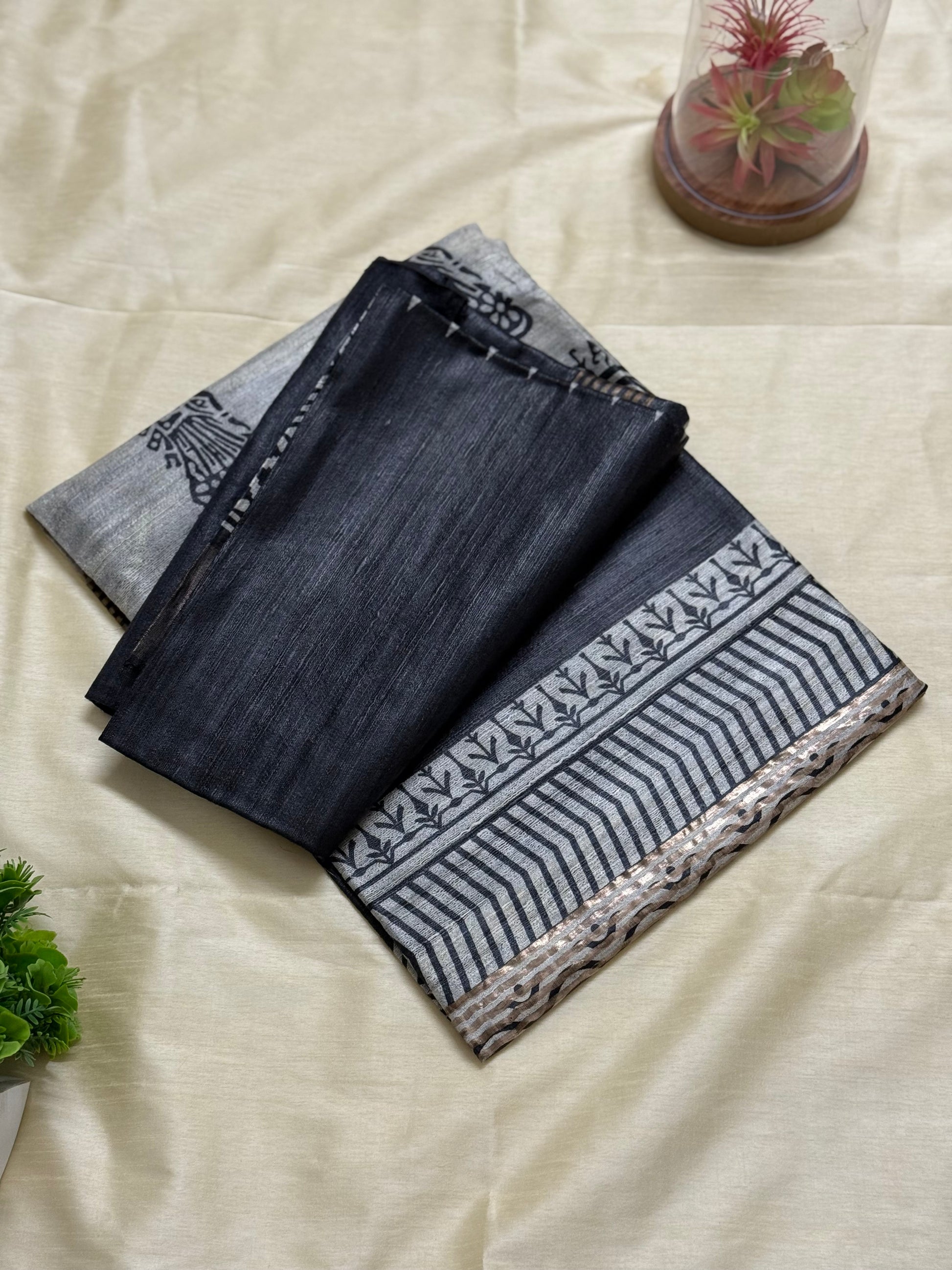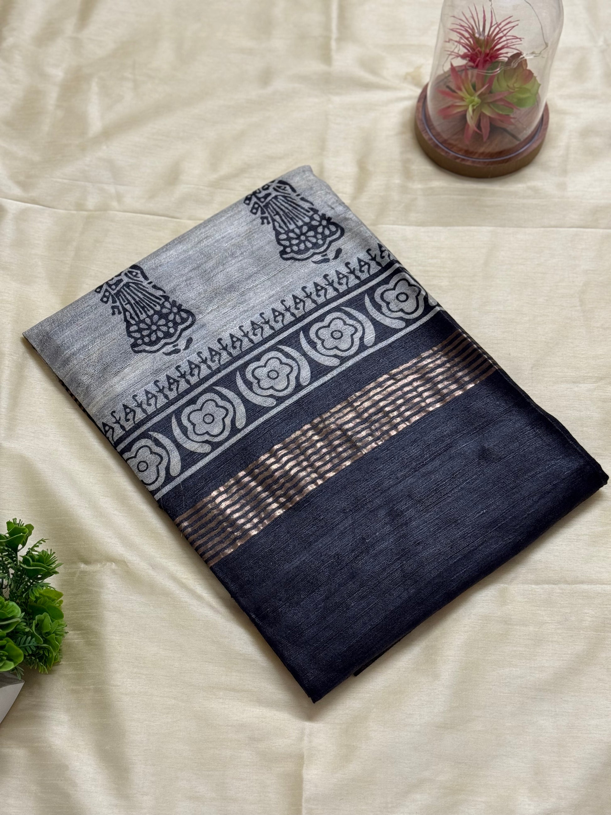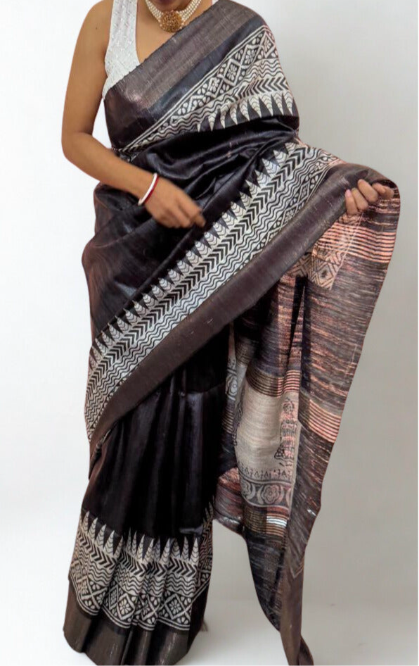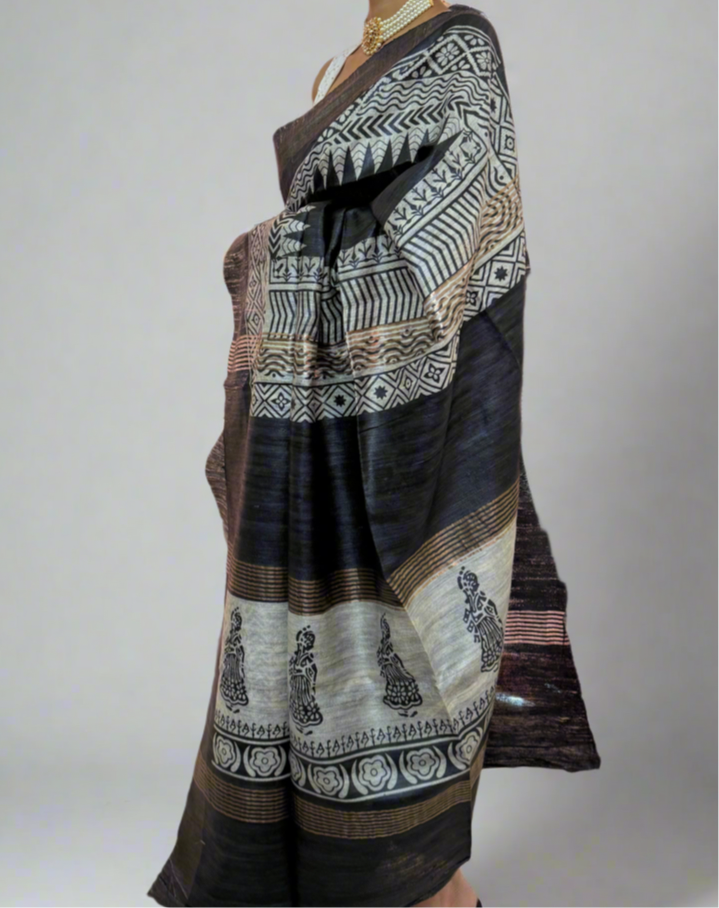 Black Tussar Ghicha Silk Saree with Madhubani Print